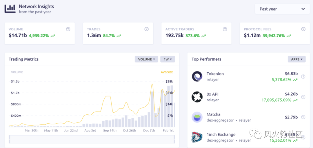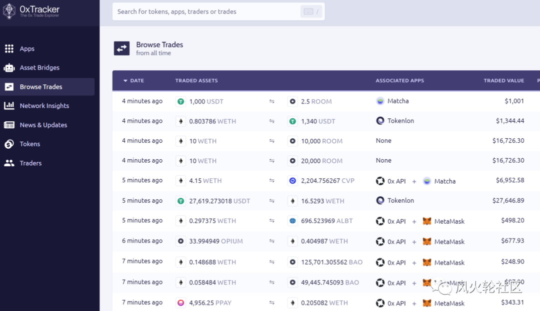0x上呢通过智能合约可以来实现整合现在市场里面最好的价格进行买卖,而且不管是AMM平台还是传统订单薄模式都可以,目前看dex市场聚合多一点,但看去年项目方的一份资料,好像是可以实现链上和链下(中心交易所)的流动性聚合。在0xtracker.com上可以看到平台的一些基本面数据,像下图是利用了他们聚合合约进行交互的记录: