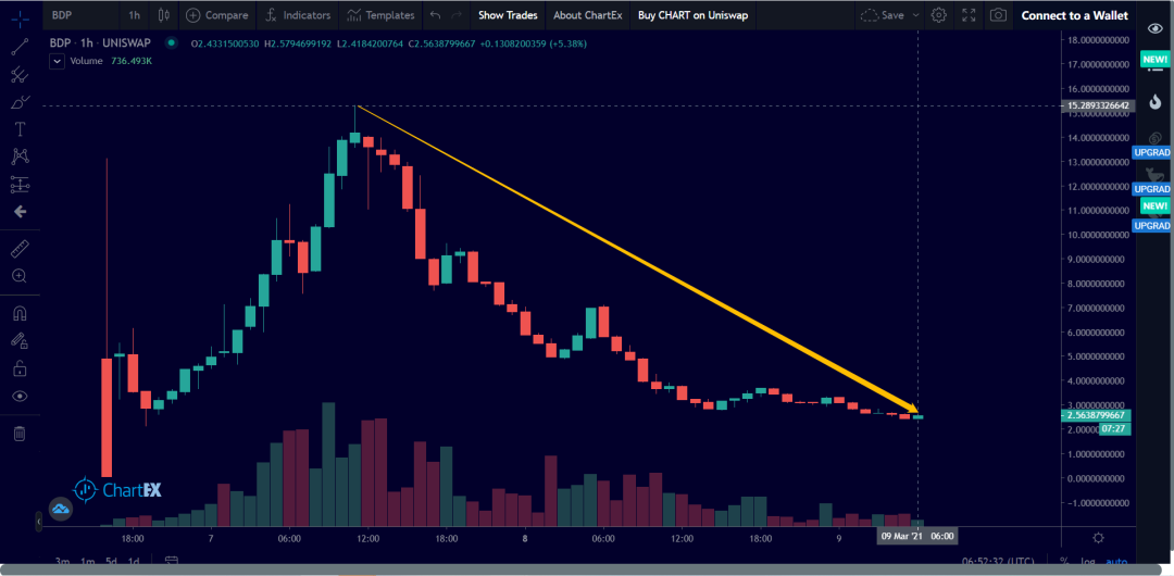 3月7日晚间,随着BDP在抹茶交易所开放交易,BDP价格冲到15美元高位,这也成了BDP迄今的最高价。此后,尽管BDP的TVL继续飙升,但币价并未同步,而是一路下跌。目前价格是2.5美元,较最高价跌去80%。