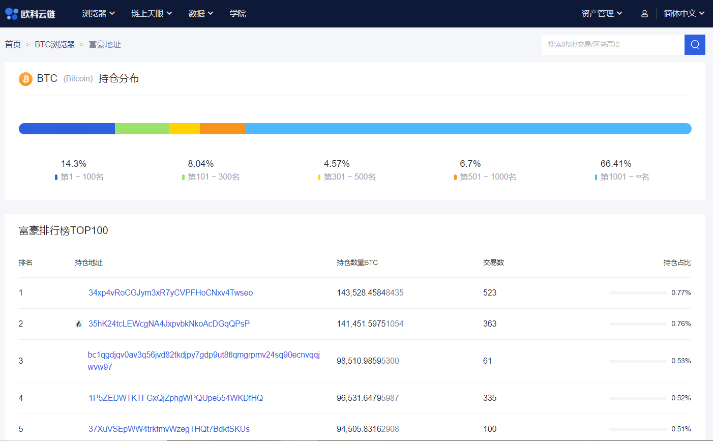 与此同时,持仓前十名的比特币地址当前共计持有96.28万枚比特币,占当前比特币供应量的5.20%,较上周上升1.76万枚。持仓前一千名的比特币地址共计持有625.29万枚比特币,占当前比特币流通量的33.59%,较上周上升1.37万枚。