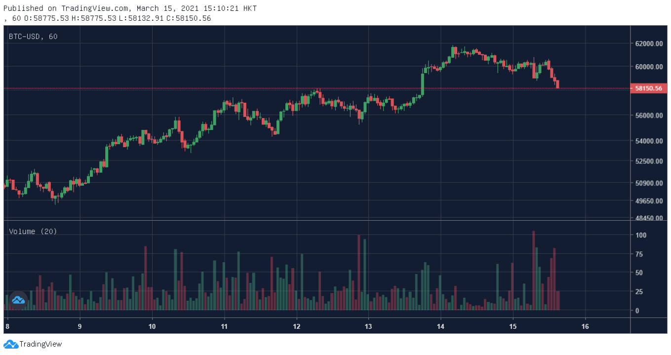 伴随着美国政府开始发放首批拜登疫情纾困法案下1400美元的补助金,比特币在周末冲上60000美元整数关口,再度创下历史新高。不过在突破60000美元整数关口后,比特币出现小幅的回落,最终收于59690美元,周内涨幅18.06%,连续两周保持在15%以上的涨幅。