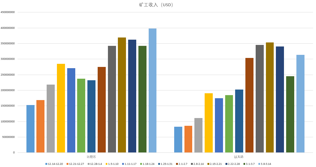 上周比特币矿工收益为7149 BTC,约合3.98亿美元,环比回升16.70%;而以太坊的矿工收益为17.26万ETH,约合3.13亿美元,环比上升27.77%。