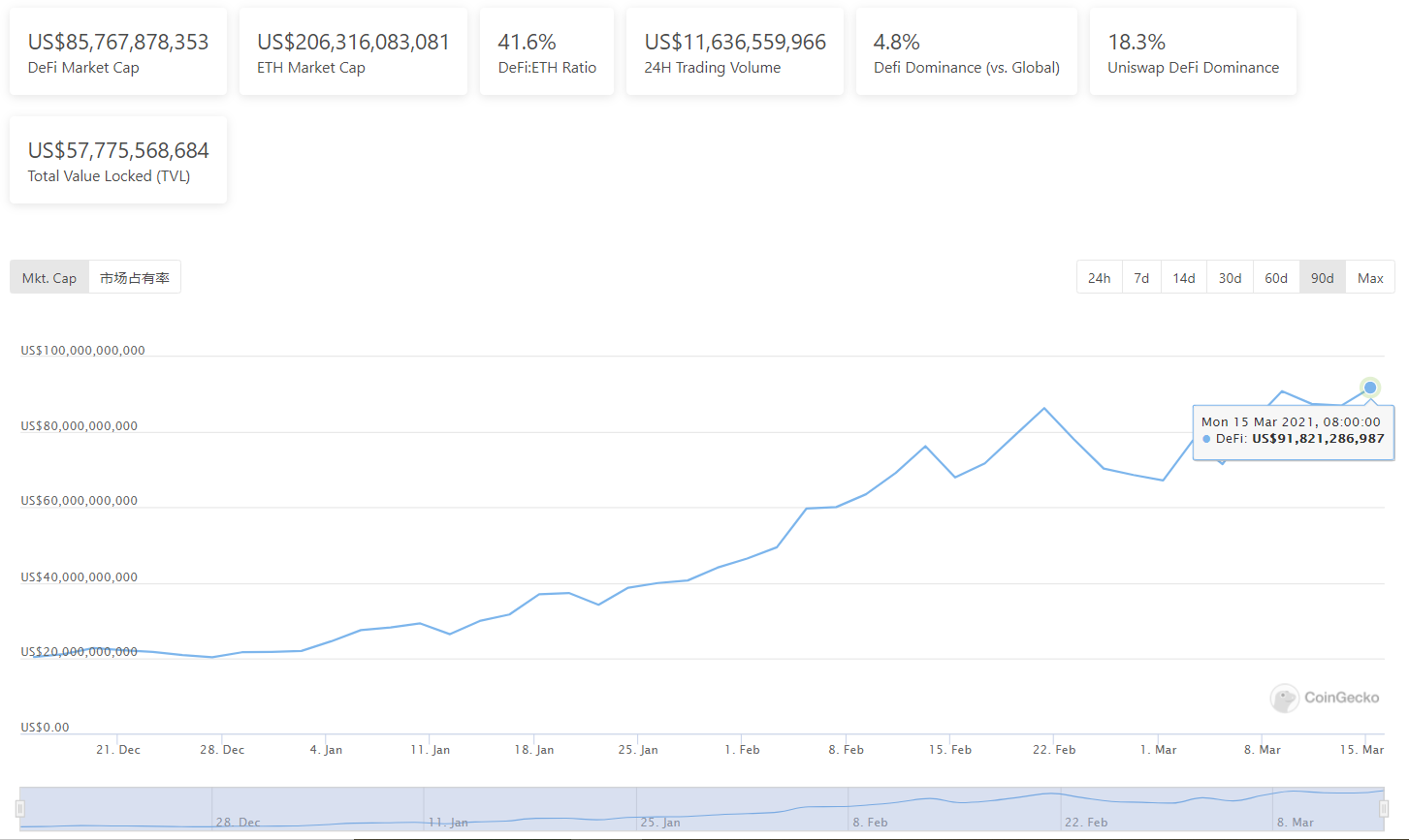 虽然以太坊上DeFi协议的锁仓量增长有些停滞,但这并不妨碍DeFi总市值的继续上行。当前Top 100 DeFi协议的总市值已经突破900亿美元,达到918.21亿,较上周同期增长10.86%。