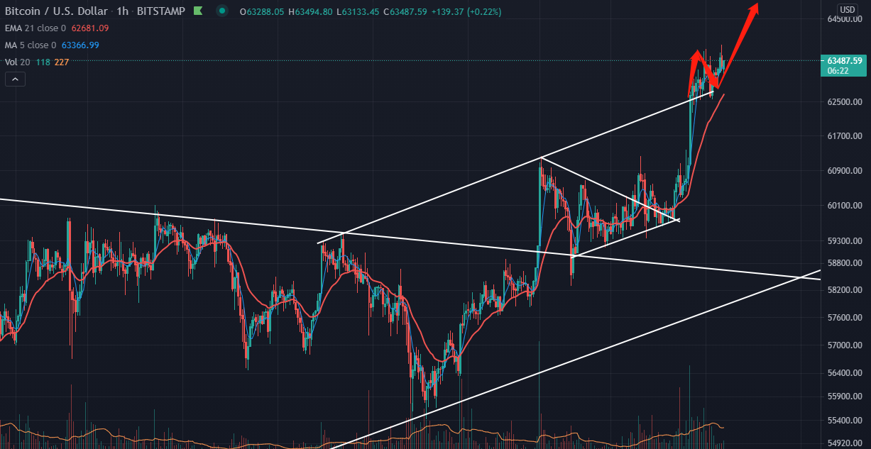 比特币如我们所料,昨日创下历史新高,目前站上上行通道上方,并且在1小时级别进行了一次确认,我们预期比特币在今日会继续上行,突破新高。