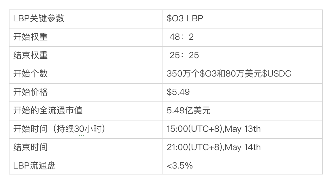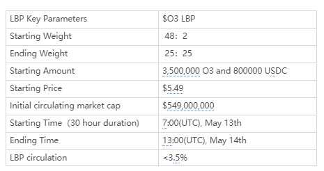 在LBP开始时,我们将投入350万枚O3和80万枚USDC,起始价5.49美元/枚。详情请看