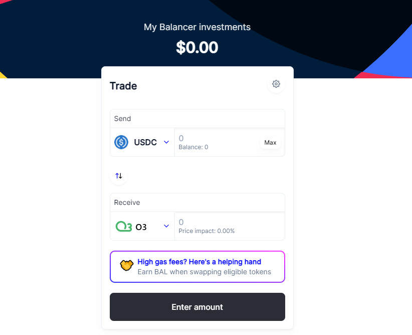 如果您选择其他资产,Balancer将自动将其转换为USDC,然后交易为O3。额外的步骤可能会导致交易费用的增加。