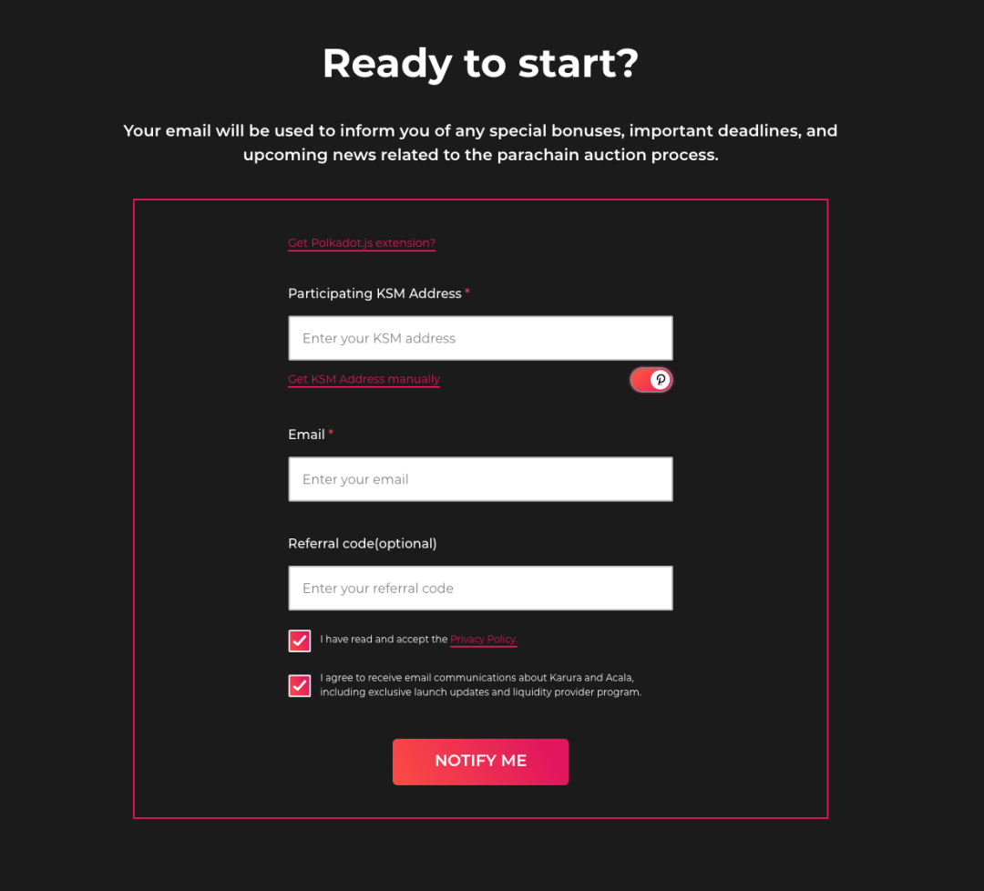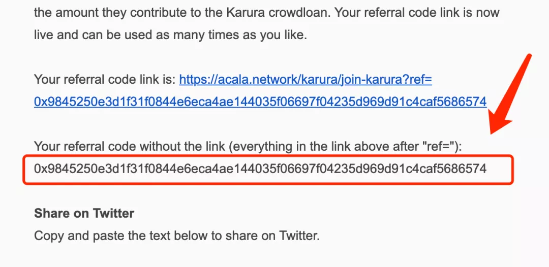 如果你在之前的平行链竞拍预热活动中正确填写了你的 KSM 地址,请查看你当时所填写的通知邮箱,专属的推荐链接与推荐码已经发送至邮箱,这意味着你将会有资格获得额外的 KAR 推荐奖励。