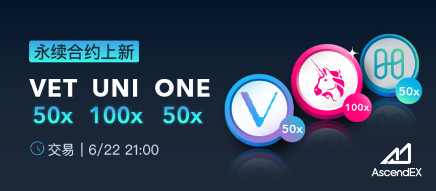 合约上新方面,顶峰AscendEX保持着不断前进的步伐。6月22日,VETUSDT、UNIUSDT、ONEUSDT永续合约强势上线Web端、APP端及API,并采用USDT定价、结算机制。其中,UNIUSDT最高支持100倍杠杆,VETUSDT及ONEUSDT最高支持50倍杠杆。