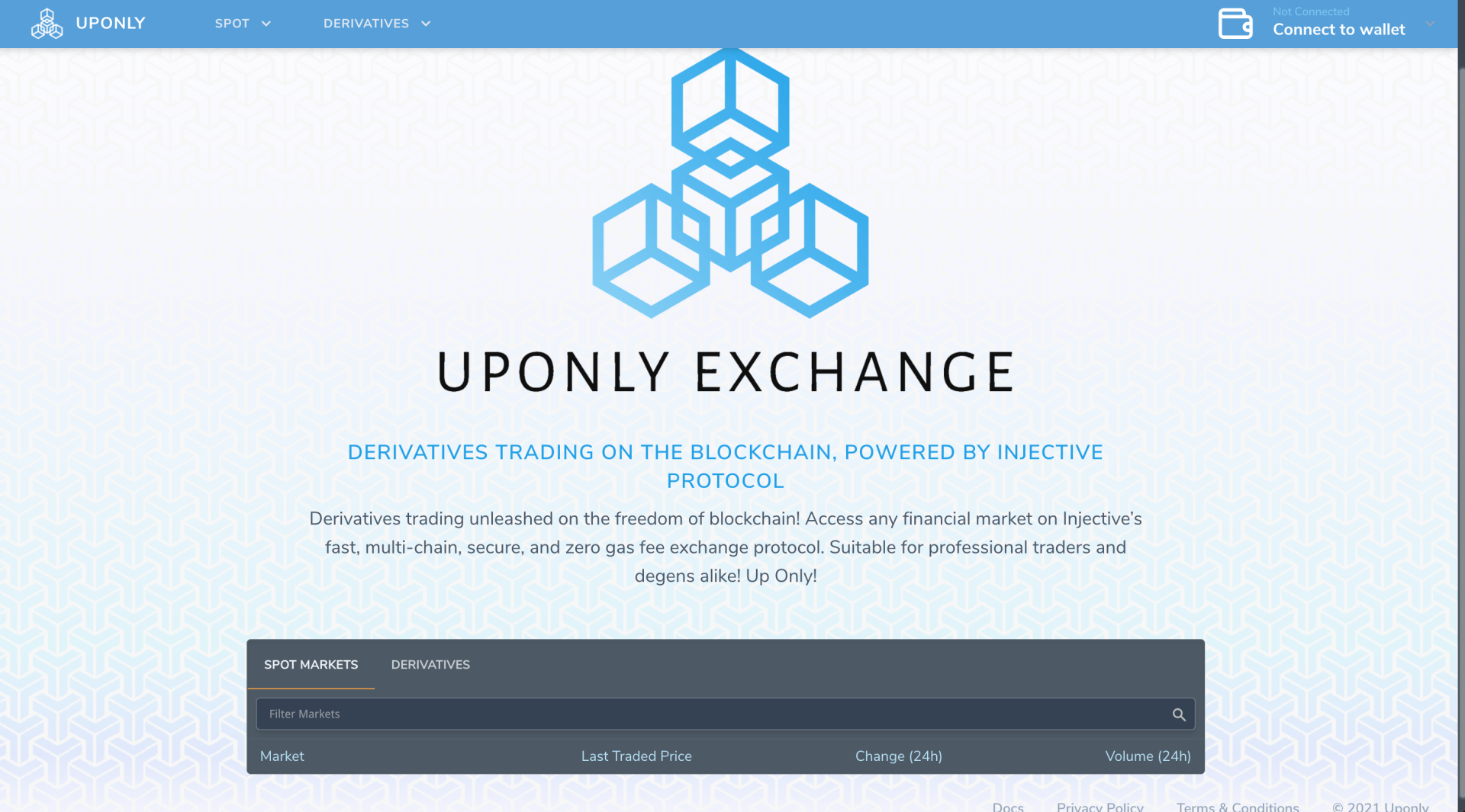 目前 Injective 上线了两个中继前端,UpOnly Exchange 是第一个交易前端,并得到著名风险基金 Genesis Block Ventures (GBV) 的支持。 UpOnly Exchange 为全球用户提供了一个直观的界面来访问 Injective Protocol,同时定制化了前端页面的设计。第二个前端是 Injective Relayer,由 Injective Labs (Injective Protocol 的服务公司)创建。