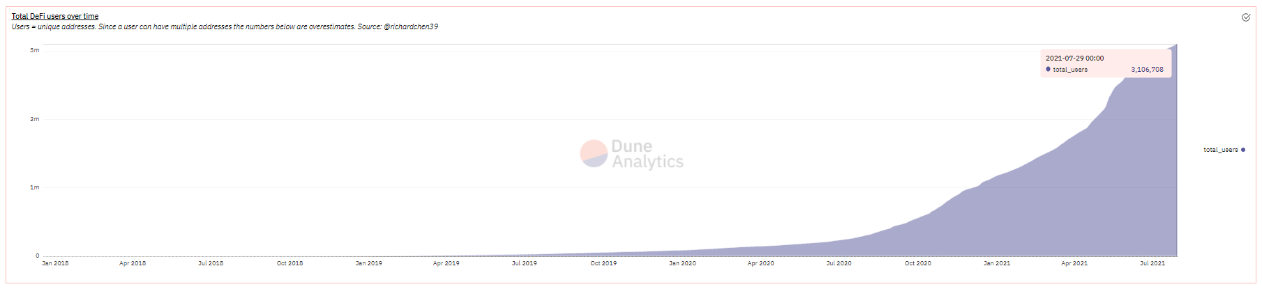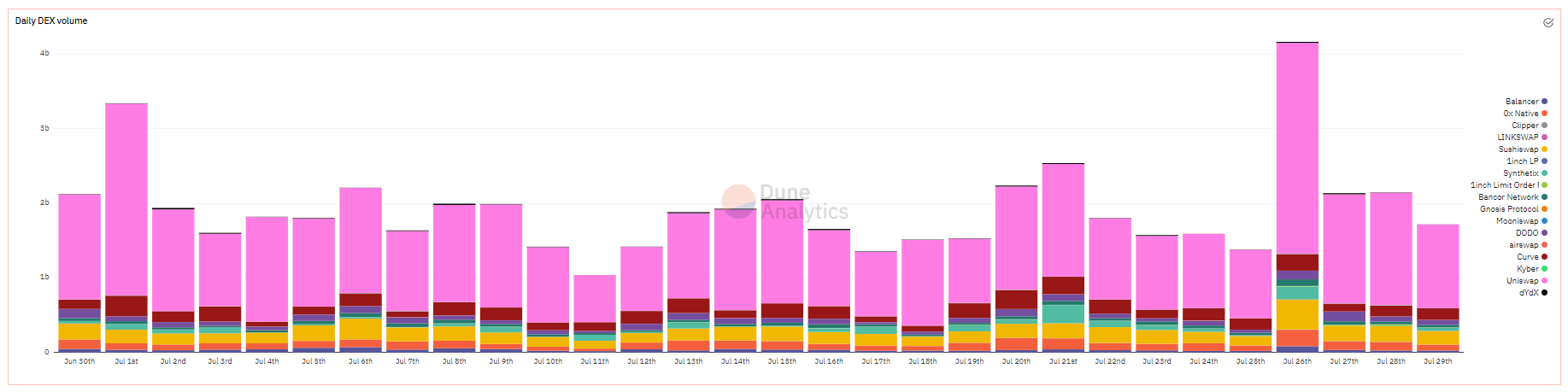 这与DeFi用户数量的持续增加密切相关,截至7月29日,用户地址数已经涨至310万个,其中,约有240万地址在使用Uniswap。7月29日,Uniswap创始人HaydenAdams发推称,Uniswap与大量金融公司和科技公司进行了接触交谈,许多有兴趣了解DeFi的公司也都表达了合作的意愿。
