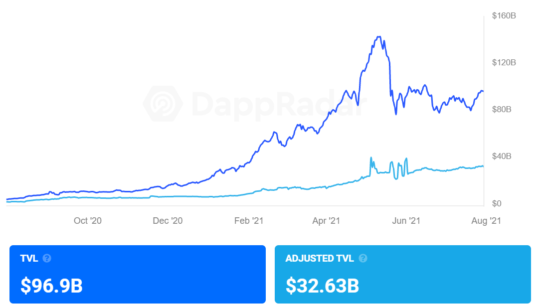 TVL指由DeFi应用程序管理的所有加密资产的美元价值。由于加密市场的波动性,TVL直接反映出的往往是价格的变动而不是DeFi资产负债表的变化。AdjustedTVL指的是调整后的TVL,该数据可以准确反映DeFi上加密资产的余额变化。