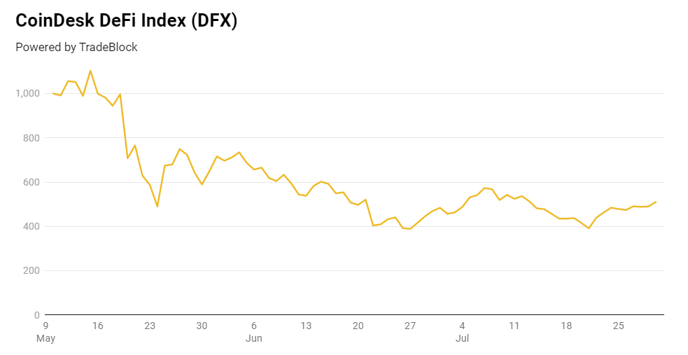 自从BTC价格从高位回撤之后,DeFi板块也遭受了重创。但是,DeFi的实际应用使其拥有较强的基本面支撑,近一个月以来,CoinDeskDeFi指数在400附近两次出现强势反弹,若大盘企稳,有可能形成双底形态,后续走势值得关注。
