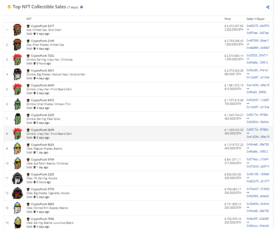据cryptoslam数据,最近7天交易价排名前14的NFT均被CryptoPunks包揽