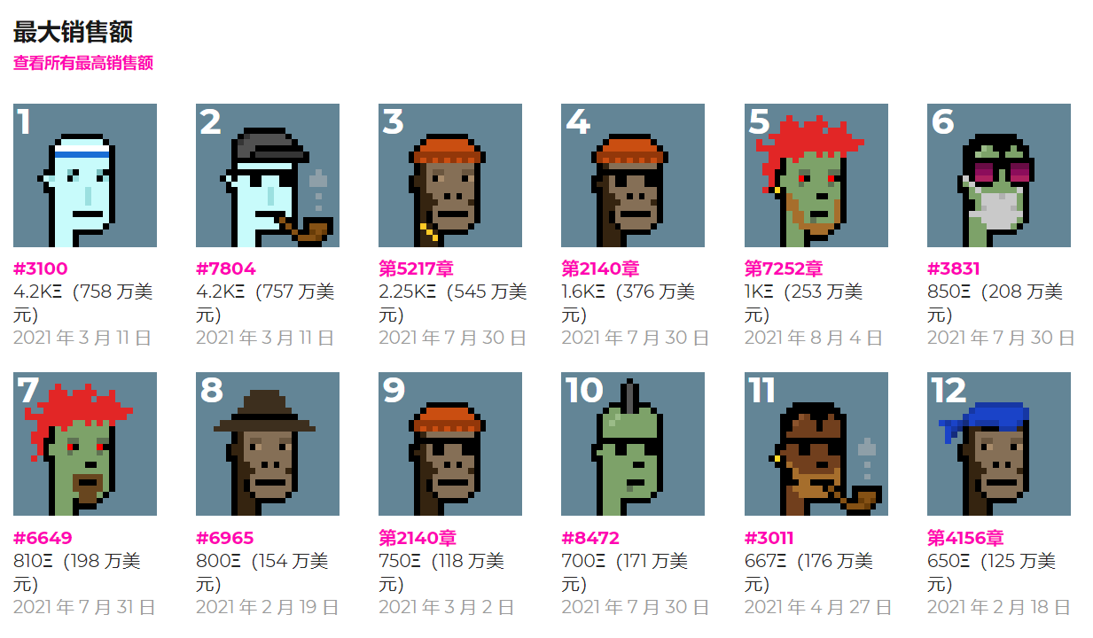 交易价格排名前十的NFT