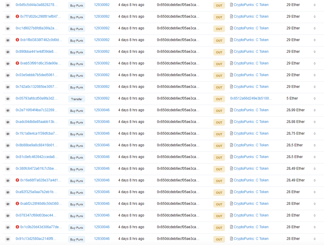 首先是巨鲸的大举买入。据Etherscan数据显示,一个0x650d打头的地址在7月30日上午开始了第一笔购买Punk的交易,交易额为28个ETH,随后短时共完成总价579个ETH的买入,约合138.96万美元。