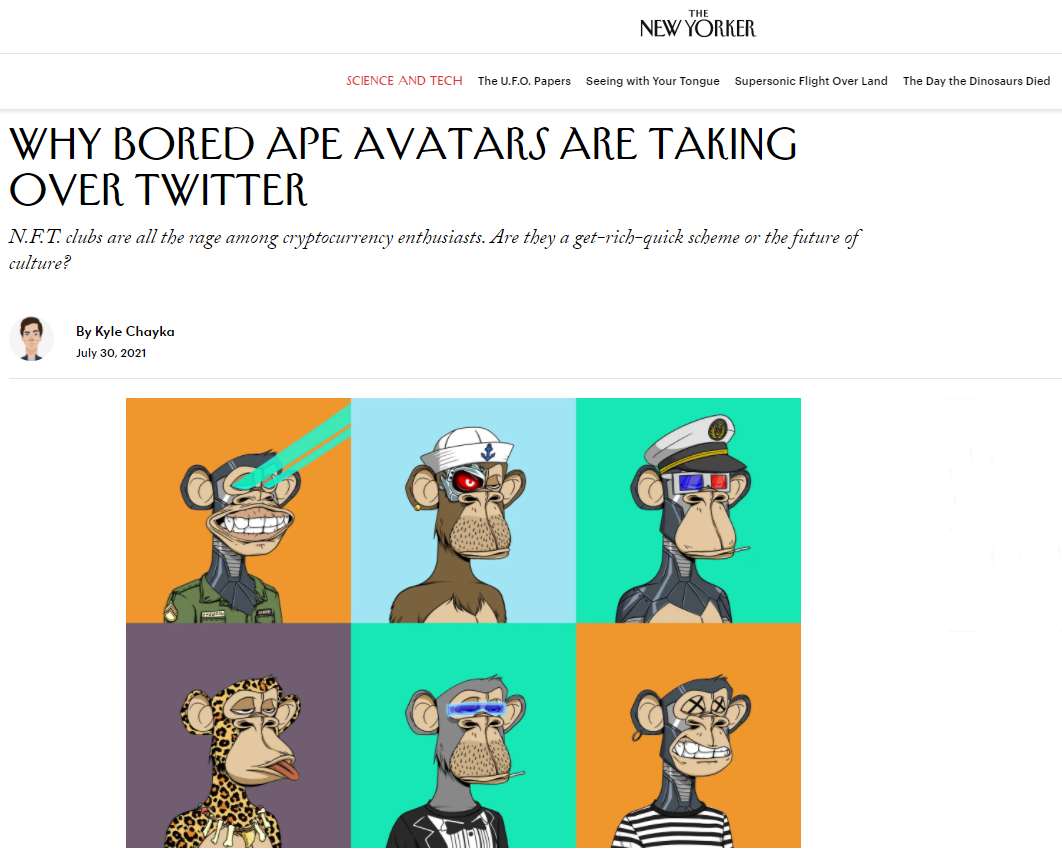 几乎与此同时,主流媒体的正面报道来为CryptoPunks添了把火。7月30日晚间,《纽约客》杂志刊发了题为《为什么猿猴头像占领了推特》一文,彻底点燃市场。