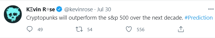 主流媒体对这一新兴事物的全景介绍和正面报道,无疑让长期游走在小众圈层的NFT玩家倍感振奋,这也是上周末CryptoPunks掀起热潮的直接外因。此外,True Ventures风投公司伙人Kevin Rose也在推特上公开直言,称未来十年,CryptoPunks将超越标普500的表现。他还在评论区中表示将为自己的论断负责。