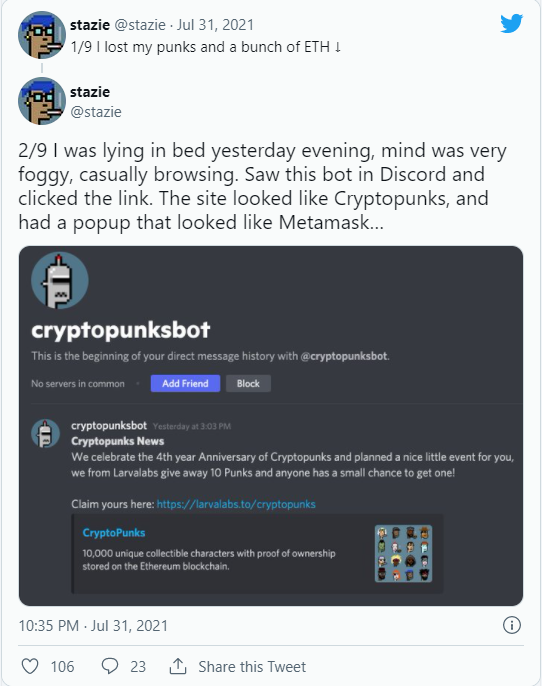 阳光之下,CryptoPunks也藏暗影。据Decrypt报道,近日,一位名叫Stazie的NFT游戏创业者,因为在Discord中,相信了代号“cryptopksbot”的骗子(cryptopksbot称向其转入Punks NFT即可获得高收益,以庆祝CryptoPunks上线4周年),将账户中的16枚Punks转给对方,造成了至少100万美元的损失。诈骗者都嗅到了金钱味道,也从一个侧面说明CryptoPunks的火热。