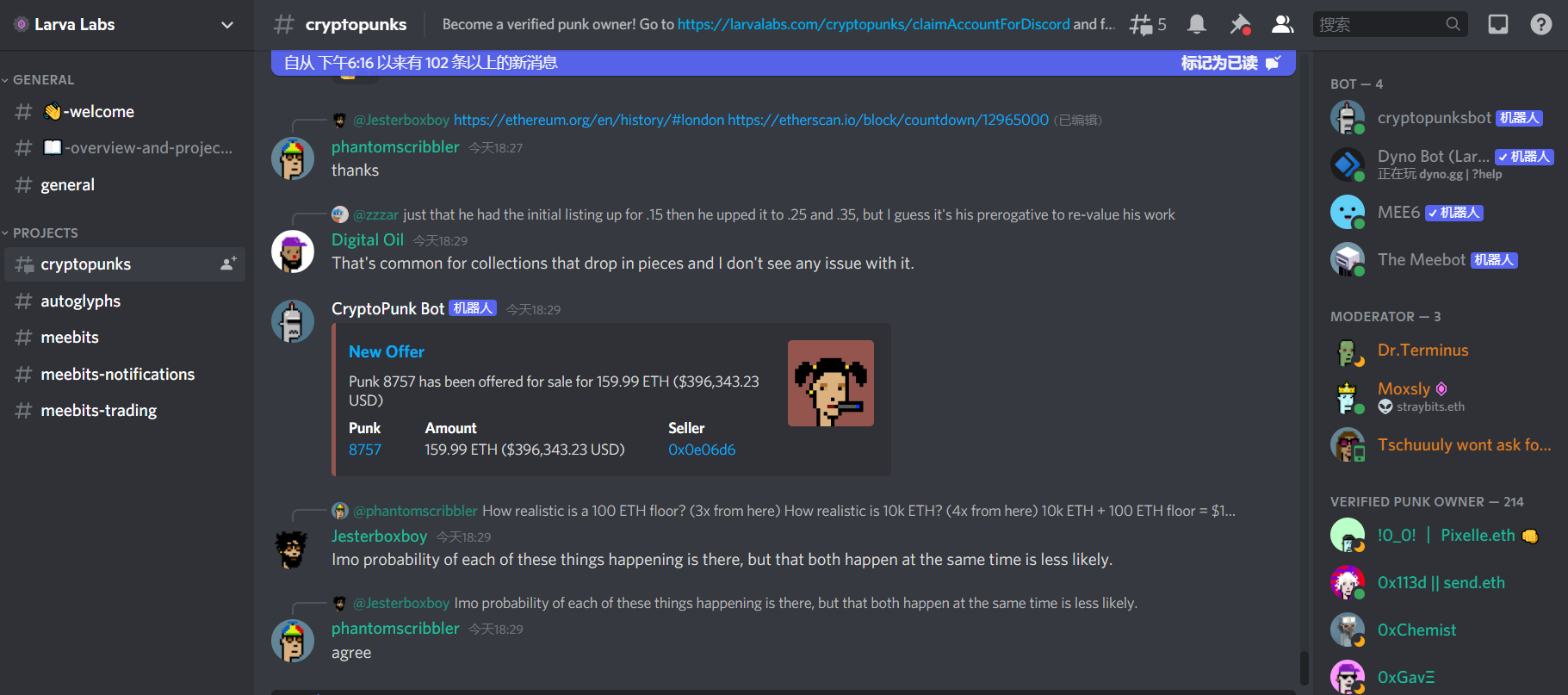 就像我们在CryptoPunks的Discord中看到的,既有名为CryptoPunks的机器人账号为新出售的NFT喊单,也有玩家们五花八门的闲聊。