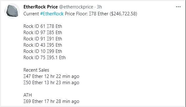 EtherRocks 的价格在上周末翻了一倍,而本周一又翻了一倍!根据跟踪 EtherRocks 价格的推特账户 @EtherRockPrice 的数据,截止撰文时,目前市场上最便宜的一块 EtherRock 石头已经达到了 78 ETH,约合 246,722 美元!有些石头现在的售价甚至已经达到了 99 ETH (撰文时约合 32 万美元)。而就在几天前,这些石头的售价仅约为 5 万美元。