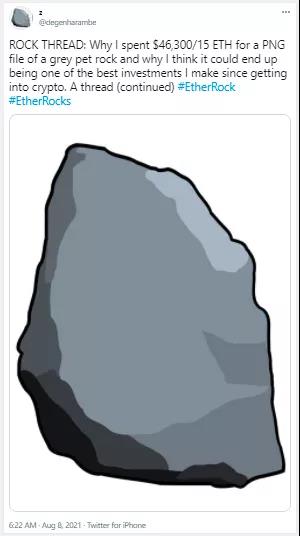 一位自称持有 EtherRock NFT 的人发推文声称,上周末他用了 15 ETH (当时价值 46,300 美元) 购买了编号为 #74 的一块 EtherRock「石头」(见下图),并阐述为何他认为这将是他在加密领域中做出的“最好的投资之一”。他写道: