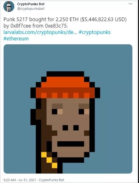 最近几周,CryptoPunk 的销售价格也达到了数百万美元,其中包括在 7 月底,编号为 #5217 的 CryptoPunk NFT 头像以 2,250 ETH (当时价值约 540 万美元) 的价格被售出 (见下图);几乎同时,Gary Vaynerchuk 以 1,600 ETH (当时价值约 370 万美元) 的价格购买购买了编号为 #2140 的 CryptoPunk NFT 头像。上周,一个在 2018 年仅以 443 美元的价格购买到的 CryptoPunk NFT 头像以 1,500 ETH (当时价值约 438 万美元) 的价格被售出。