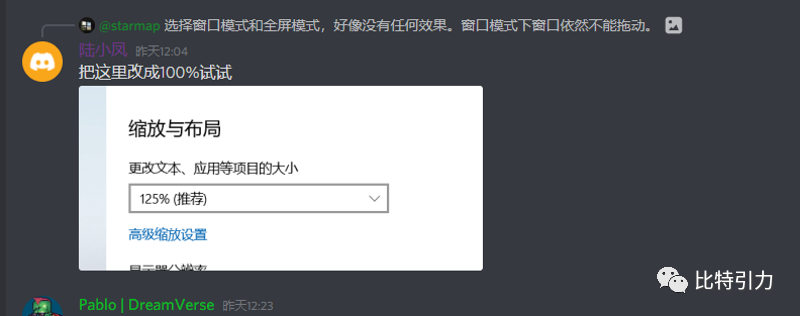 3)客户端界面无法全屏。其实我看到客户端是有配置窗口模式的选项,但我发现配置后点击 apply 是失效的,建议后续优化。目前在 DC 给出的临时方案(供玩家参考):电脑--->显示--->放大缩小调整为100%