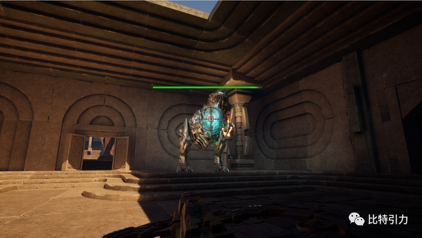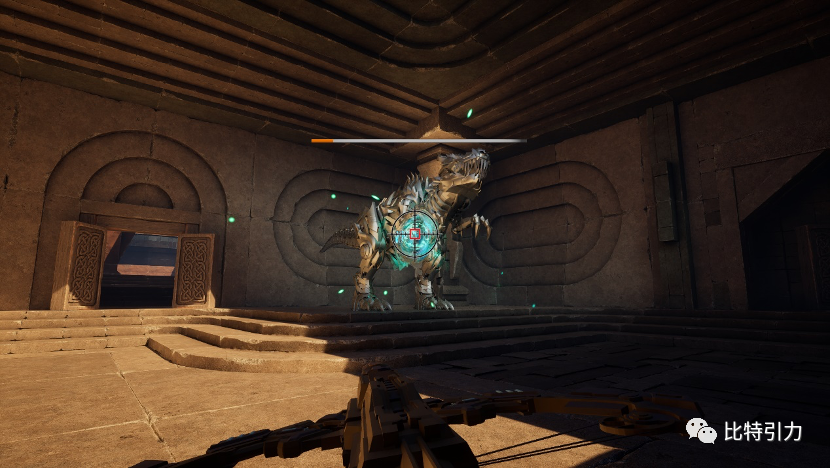 第 4 个固定元素,我发现有些场景是有的,有些场景没有,我理解这是进入格斗模式或游戏模式的意思。进入之后会有怪物 Boss,同时你的视场角会切换到让你身临其境,手上有武器,应该是一个激光炮吧,你可以用激光炮攻击这个Boss,Boss头顶有血条,当血条没了,Boss就倒了,然后你可以选择重新再打或者退出格斗模式。