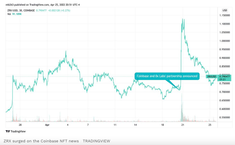 Coinbase 在公告中宣布合作关系后,0x Protocol 的原生代币 ZRX 涨逾 50% 至 1.10 美元,为去年 12 月以来的最高水平。其市值也增加 3 亿美元,达到 9.3 亿美元。此后 ZRX 回吐了大部分涨幅,但在过去一个月里仍上涨超过 20%。