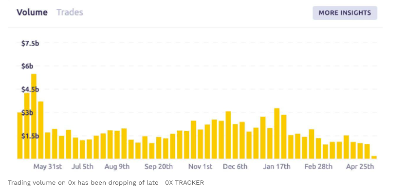 与最大的去中心化交易所相比,0x 的相关数据相对较小。例如上个月,行业领导者 Uniswap处理近 500 亿美元的交易。相比之下,0x 平均每周处理 15 亿美元的交易。今年以来 0x 交易量一直在下降,但这与所有平台交易量下降的行业趋势相符合。