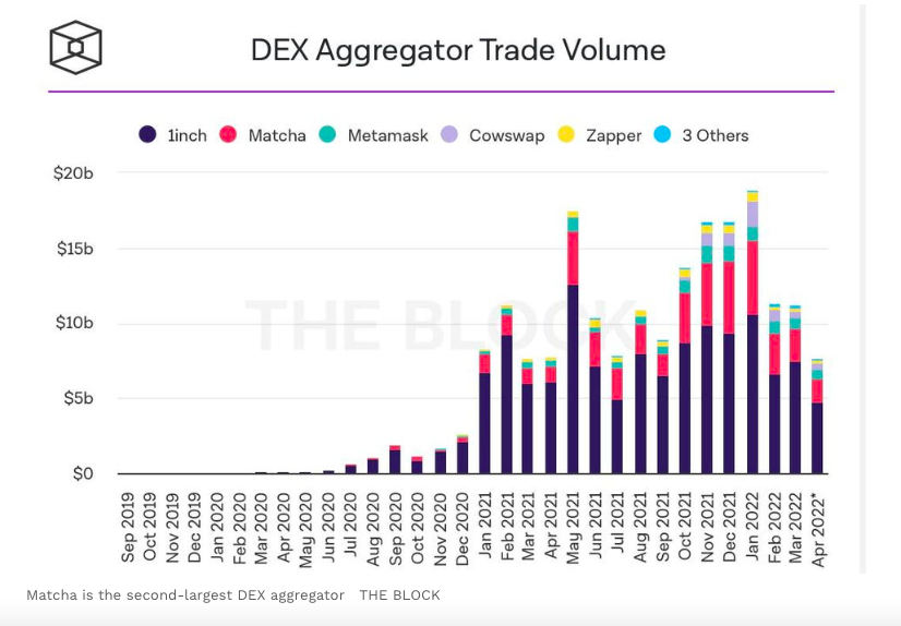 该公司还运营着业内第二大去中心化交易所聚合器 Matcha。 Matcha 旨在通过从多个加密货币交易所中选择最佳价格来优化交易。根据 The Block 的数据,今年 3 月 DEX 聚合器总交易额达 111.9 亿美元,其中 Matcha 交易额达 21.3 亿美元,仅次于行业领先者 1inch。