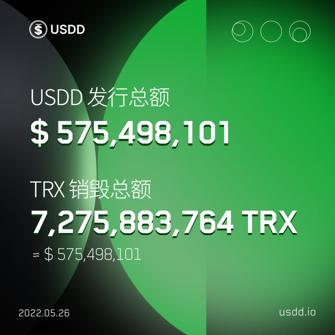据最新消息,截至5月26日,波场去中心化算法稳定币USDD发行总额为575,498,101美元,突破5.7亿美元,对应TRX销毁量为7,275,883,764 TRX,超72亿枚。