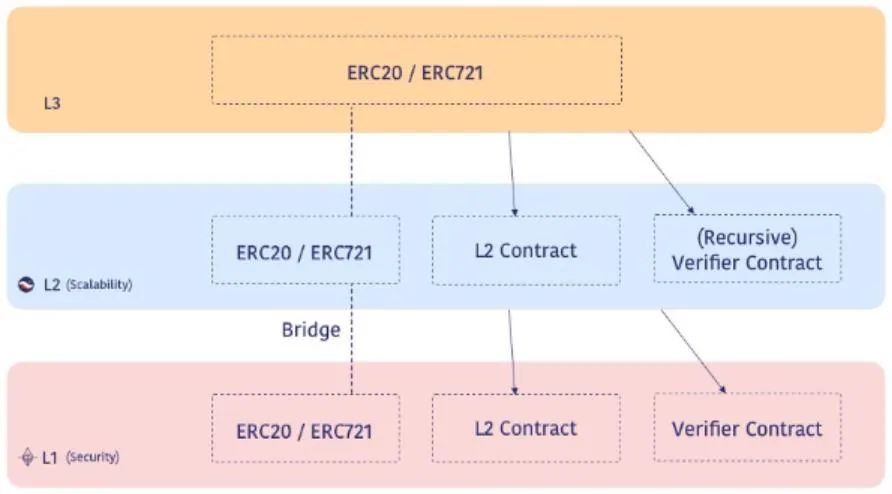 以扩容为例,L3 与 L2 的关系可类比于 L2 与 L1,L2 用于通用扩容,L3 用于可定制化扩容。可实现指数级增长的扩容。