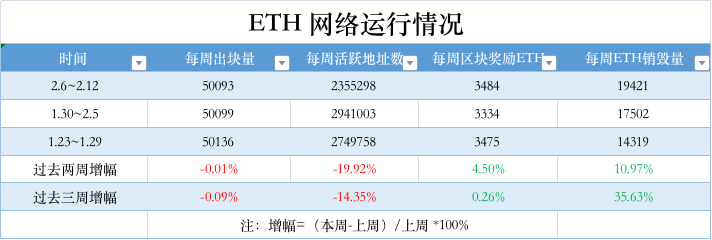 etherchain.org 数据显示,过去一周以太坊网络出块量为 50093 个,与上周基本保持一致;每周活跃地址数为 2355298 ,环比下降 20% ;区块奖励收入为 3484 枚 ETH,环比上涨 4.5% ;每周 ETH 销毁量达到 19421 个,环比上涨 11% 。