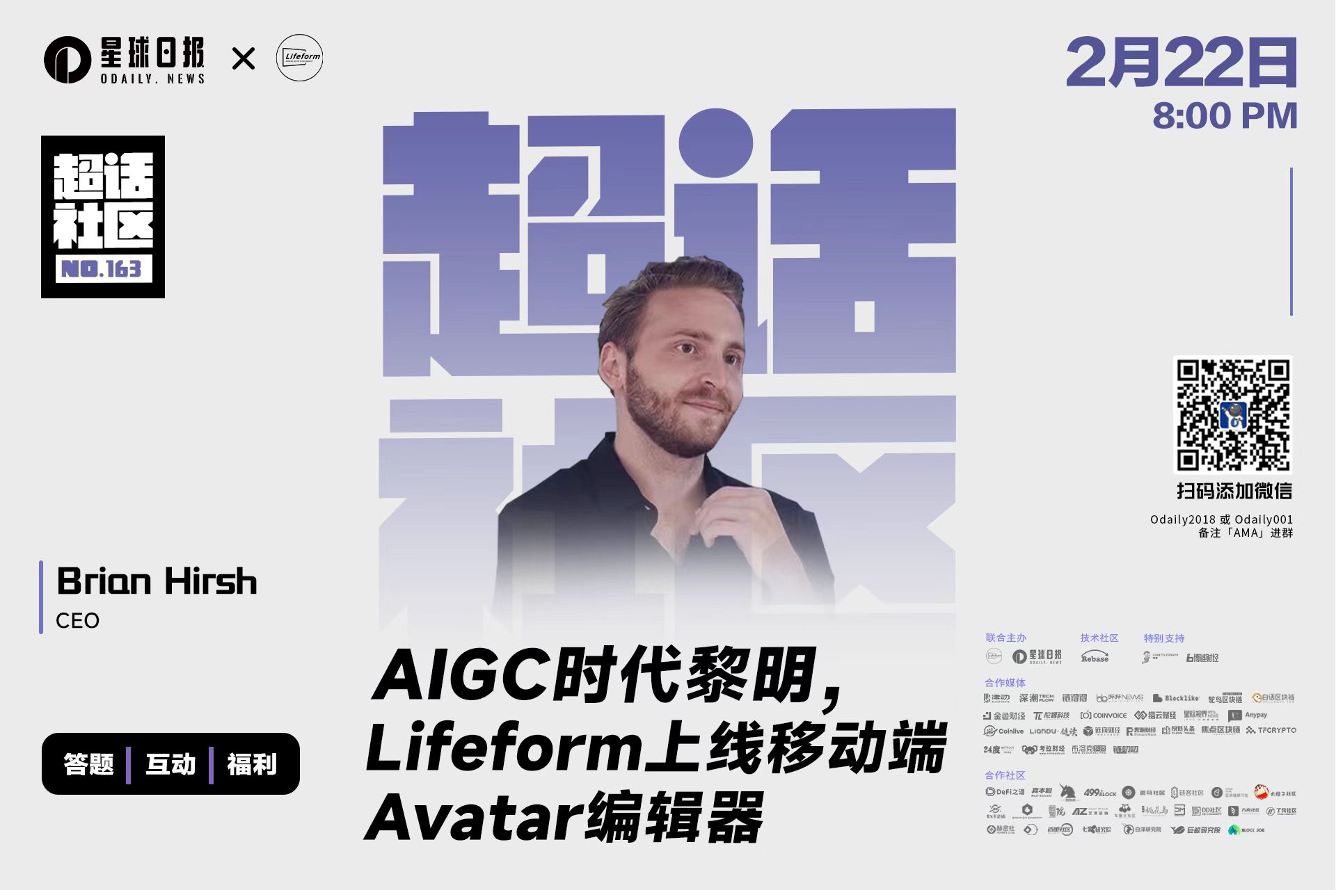 2 月 22 日晚,Lifeform 联合创始人兼 CEO Brian Hirsh,做客 Odaily星球日报超话社区,带来关于「AIGC时代黎明,Lifeform上线移动端Avatar编辑器」的主题分享,围绕 Lifeform 的新产品 Lifeform Cartoon 进行深入的探讨。