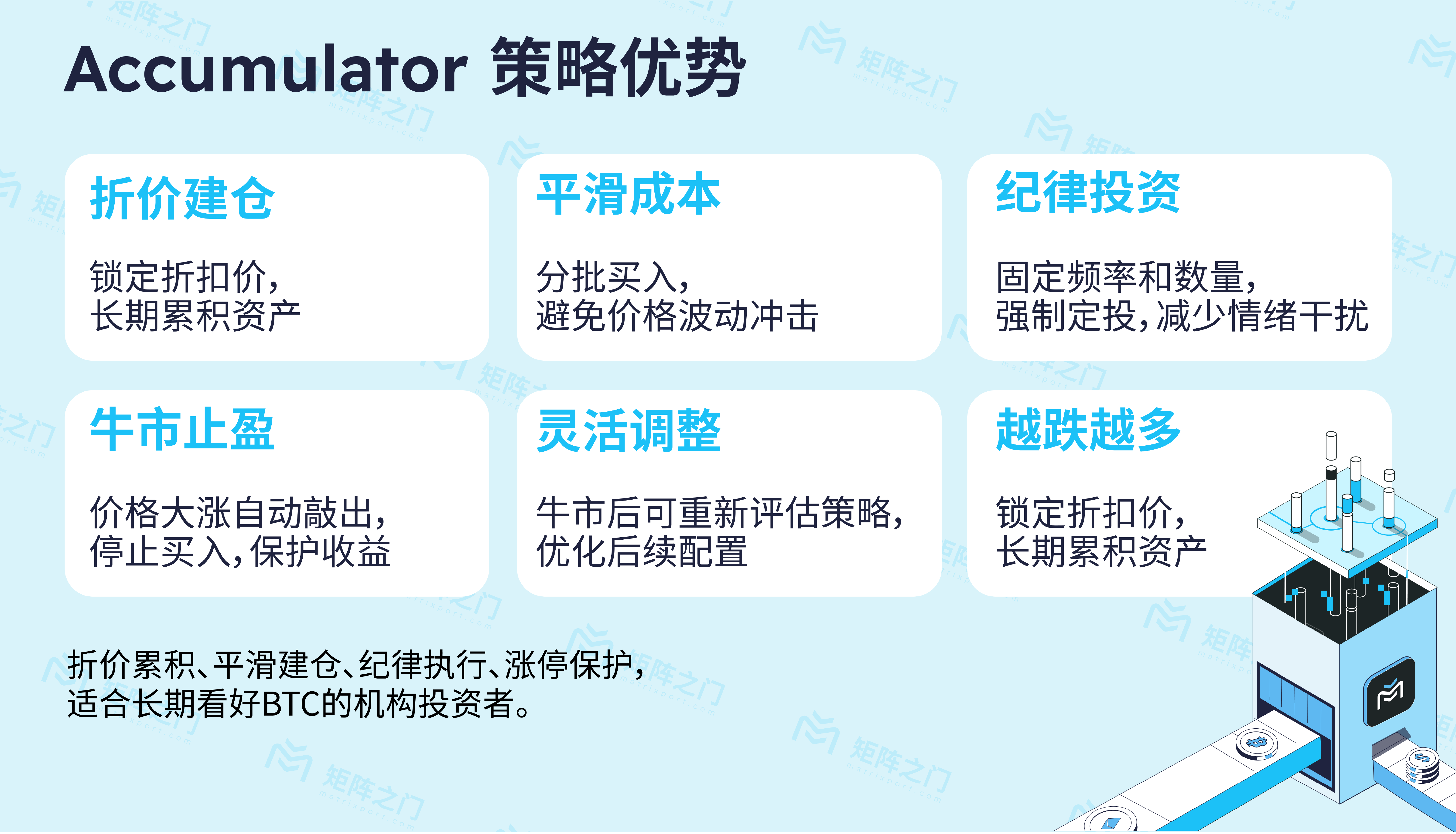我们希望这篇科普文章能够让读者了解 Accumulator 产品的原理和应用场景。重要的是让大家意识到,在瞬息万变的加密市场中,善用金融工具可以事半功倍。Matrixport 愿意作为您探索数字资产世界的伙伴,为您的财务创新之旅提供支持和服务。如果您的企业正考虑布局加密资产,不妨了解一下包括 Accumulator 在内的结构化产品组合——也许这将成为您下一个成功故事的关键一招。