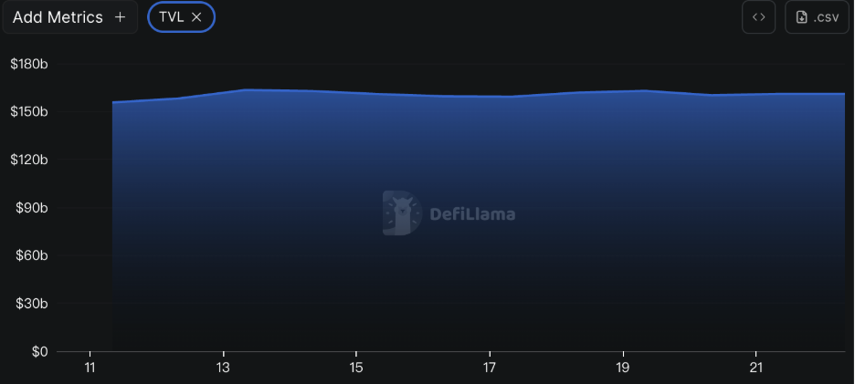 据 DeFiLlama 的数据,本周 DeFi 总 TVL 为$1,609亿,较上周1,621亿,下降约0.74%。