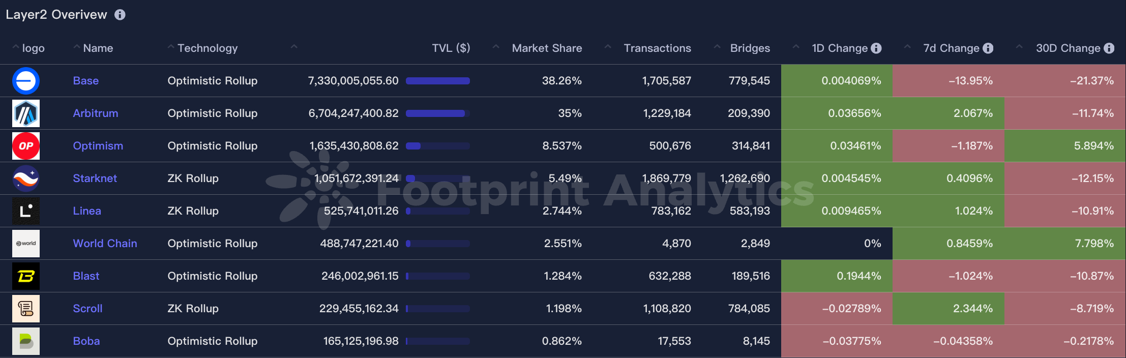 Base和 Arbitrum 分别以38.26%和 35%的市场份额占据前排,Base链过去一周市场份额略有下降,Arbitrum 有所上升。