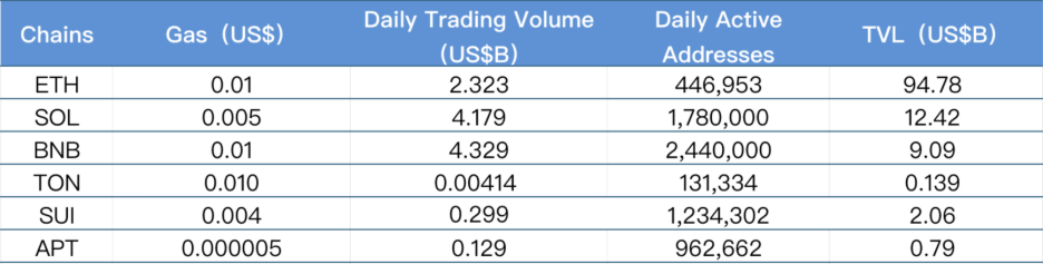 主要从日交易量、日活跃地址、交易费用分析目前主要 Layer 1 含 ETH、SOL、BNB、TON、SUI 以及 APTOS的相关数据。