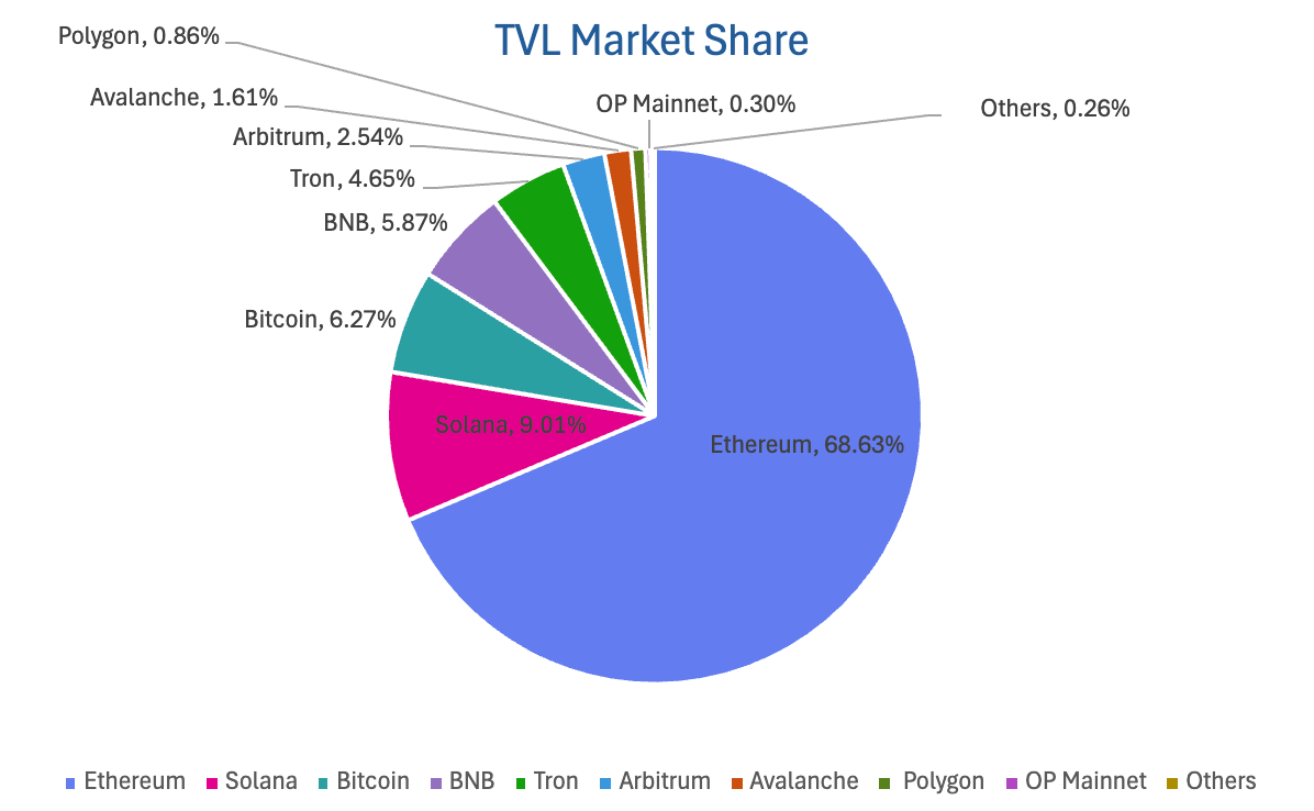 按公链进行划分,其中 TVL 最高的三条公链分别是 Ethereum 链,占比68.63%;Solana 链,占比 9.01%;Bitcoin,占比6.27%。
