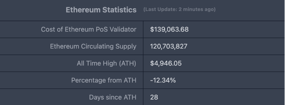 ETHUSD :现价$4,348.70,历史最高价$4,878.26,距最高价跌幅约12.34%
