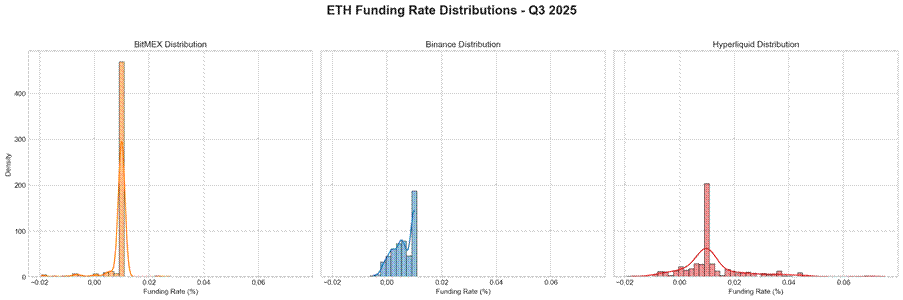 图 6:2025 年第三季度 BitMEX、币安和 Hyperliquid 的以太坊资金利率分布。该图显示,三家交易所最常见的以太坊资金费率均为 0.01%,其中 BitMEX 最稳定,而 Hyperliquid 波动性最大。