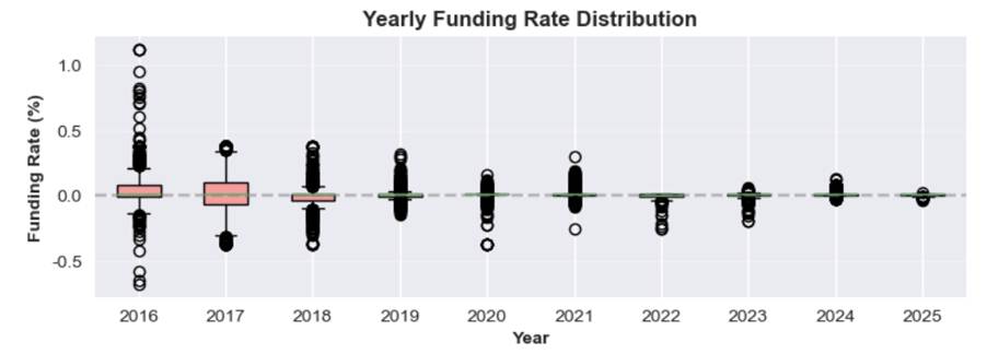 - 公式的锚点(下限):永续掉期合约公式内置利率成分,迫使利率聚集在 0.01% 左右(正偏差)。数据显示,2025 年第三季度 92% 以上的资金费率为正。