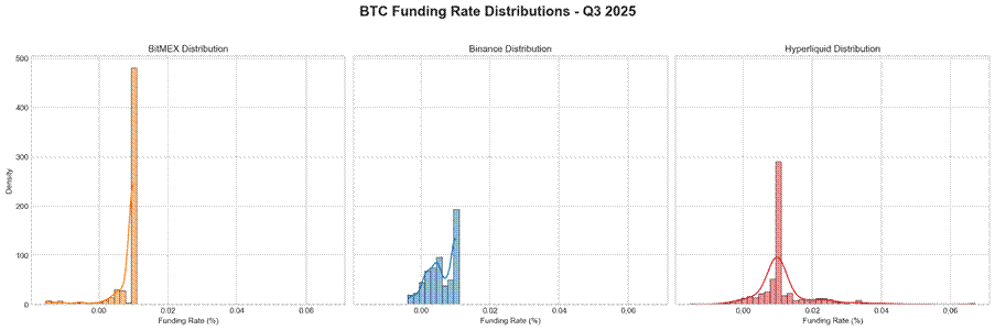 为了分析上述关于资金费率下限和上限的理论是否成立,我们分析了 BitMEX、币安和 Hyperliquid 2025 年第三季度的资金费率数据。这证实了上一节讨论的两个核心理论: